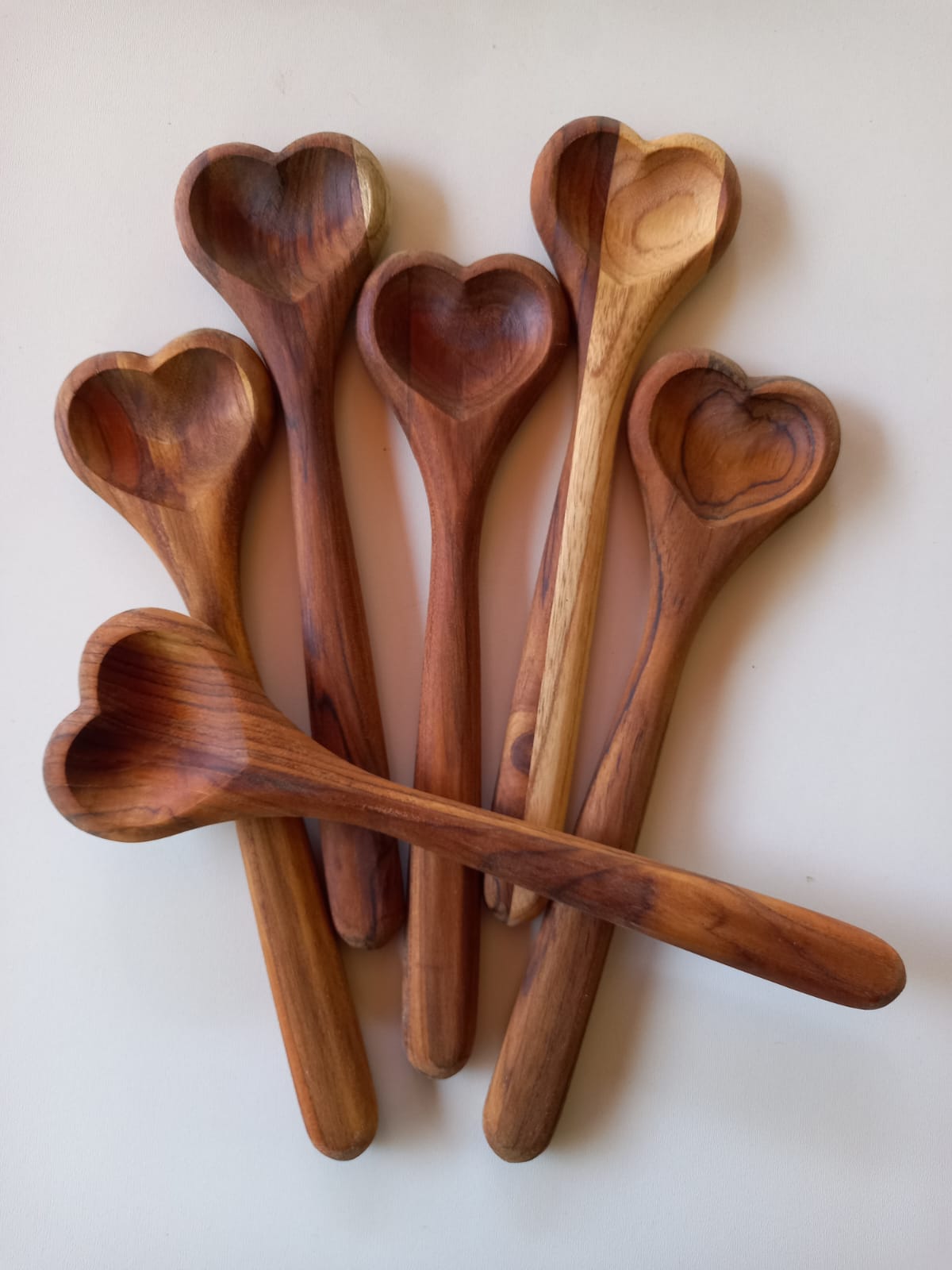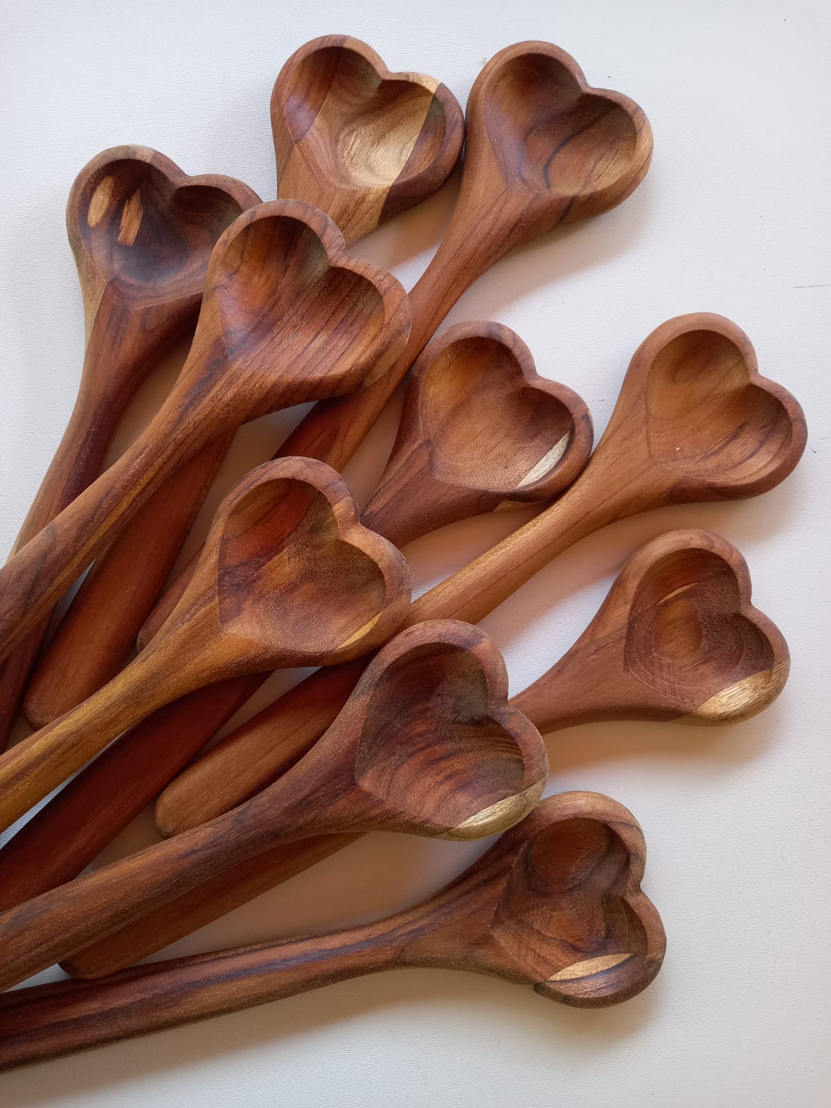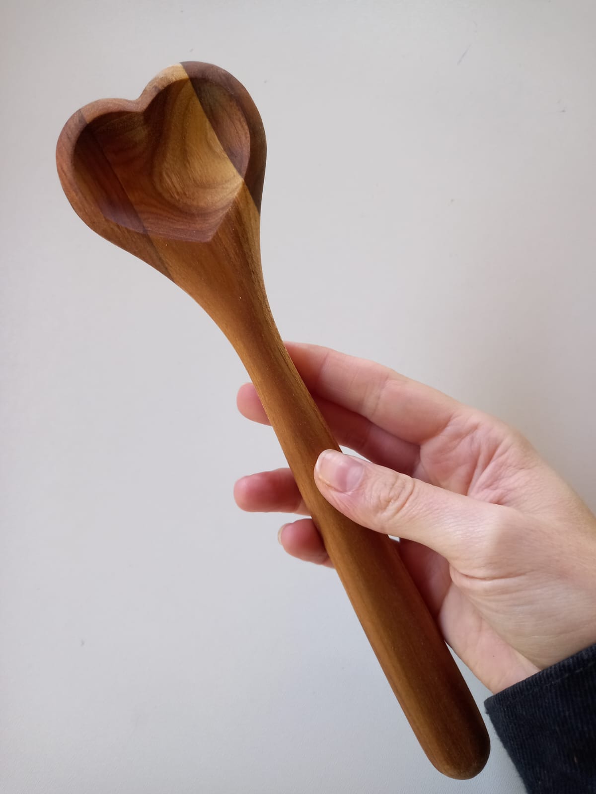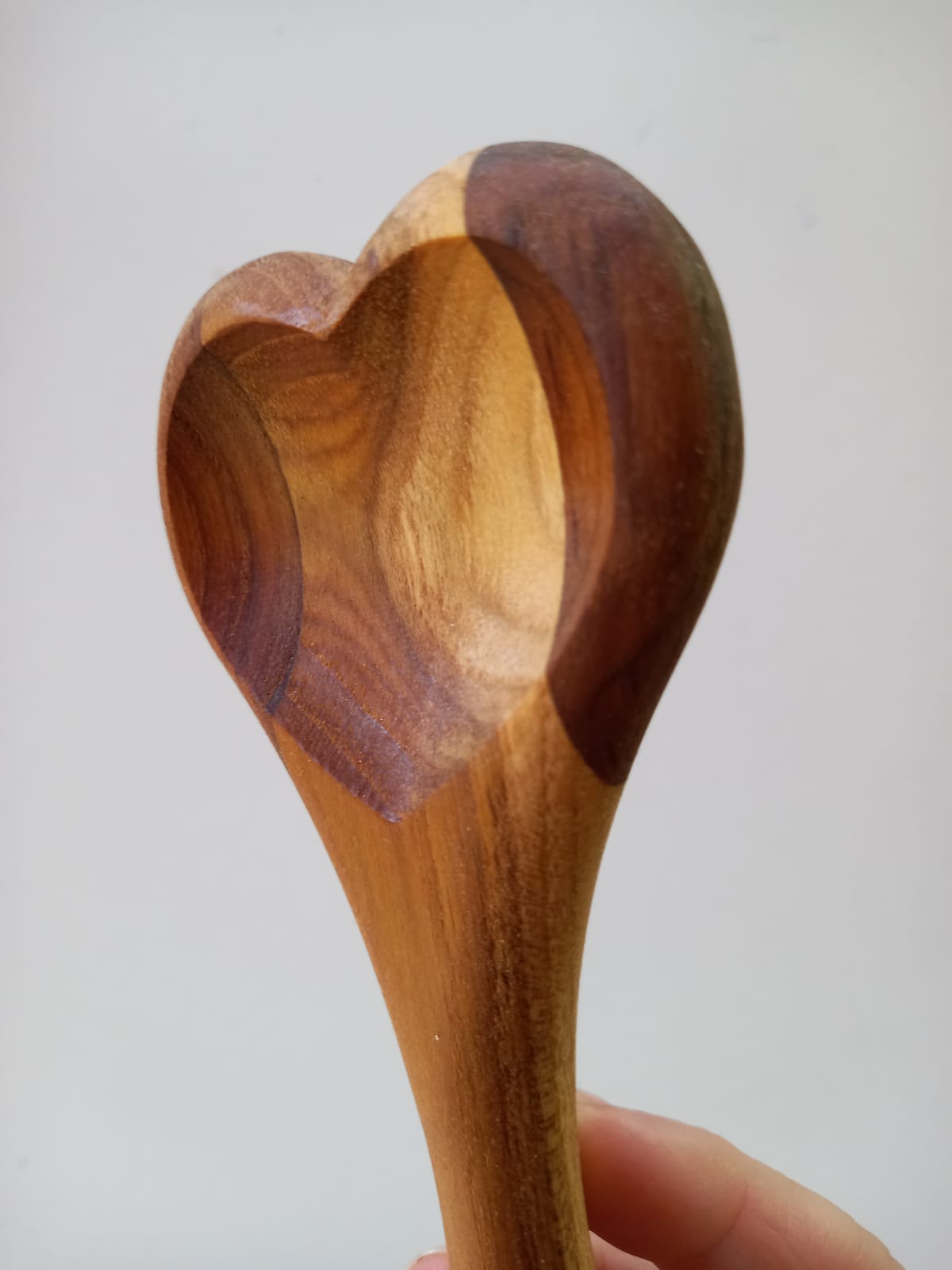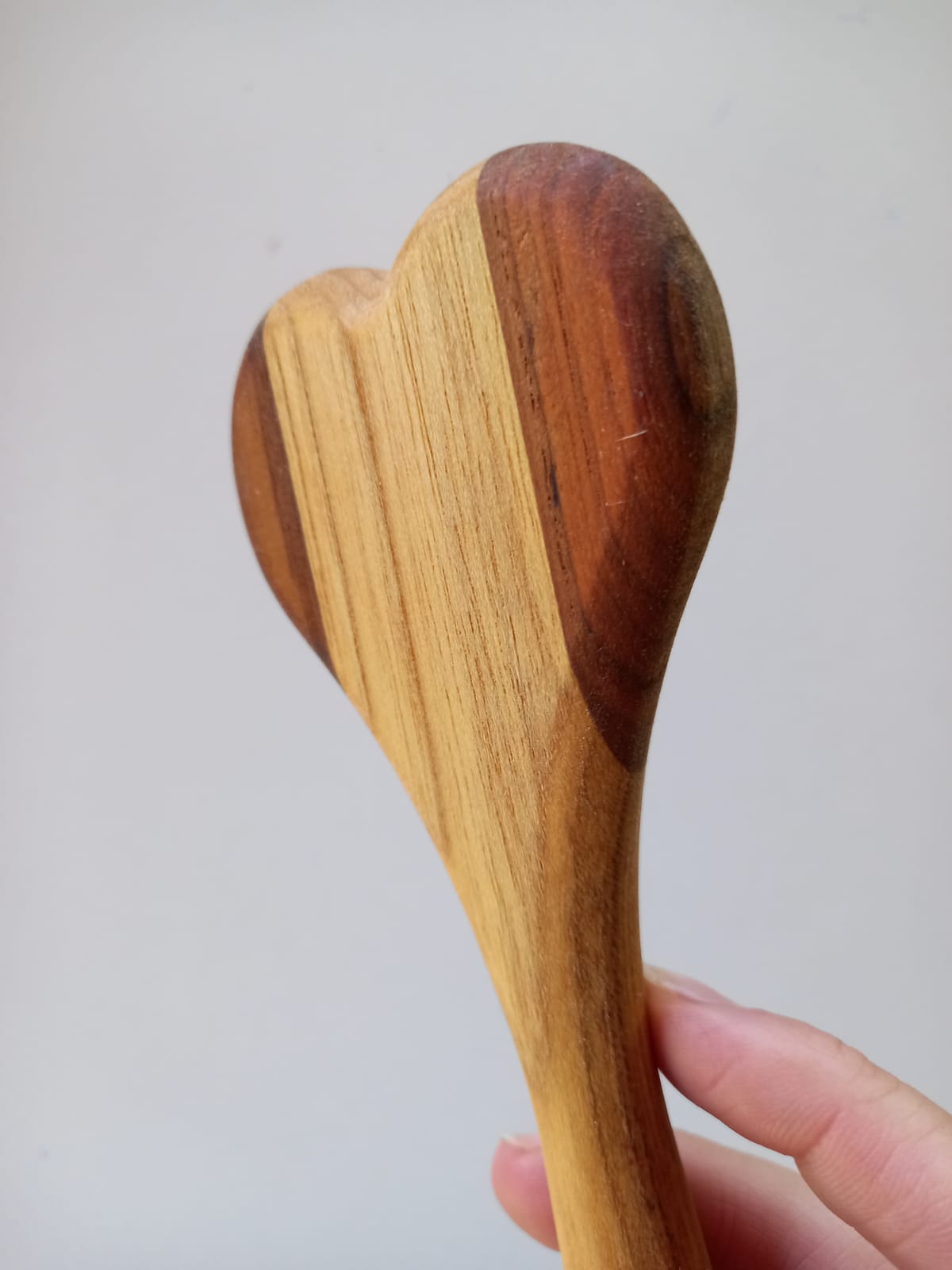 Colher de madeira em formato de coração côncavo, com aproximadamente 26 cm C x 6,5 cm L.
